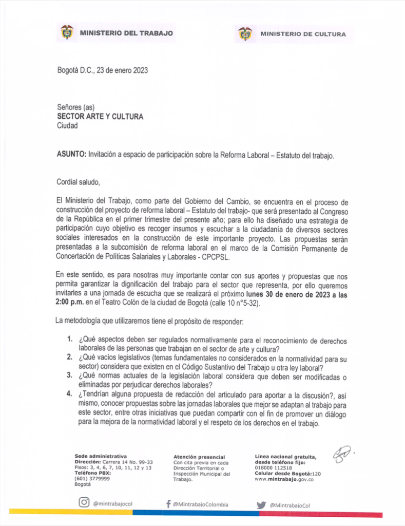Con fecha de 23 de enero, la Ministra de Cultura, Patricia Ariza, invita al espacio de participación sobre la Reforma Laboral, en el apartado del Estatuto del trabajo del sector artístico y cultural que será presentado al Congreso de la República en el primer trimestre del presente año. El objetivo de esta estrategia de …
