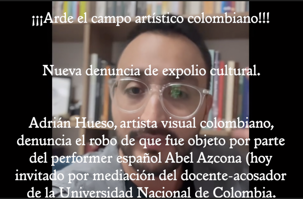 Adrián Hueso, artista visual colombiano, denuncia el robo de que fue objeto por parte del performer español Abel Azcona (hoy invitado por mediación del docente-acosador de la Universidad Nacional de Colombia, Ricardo Arcos-Palma, al Festival Internacional de Arte Contemporáneo de Manizales). *No hay redes sociales en las cuales contactar al denunciado. Video completo: …
