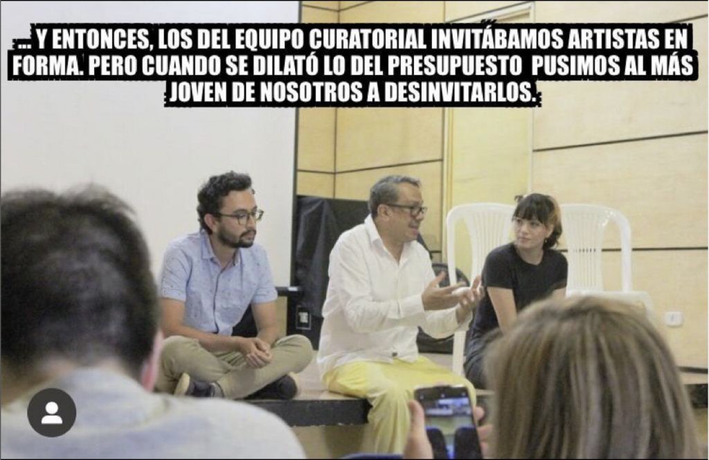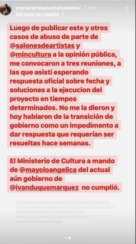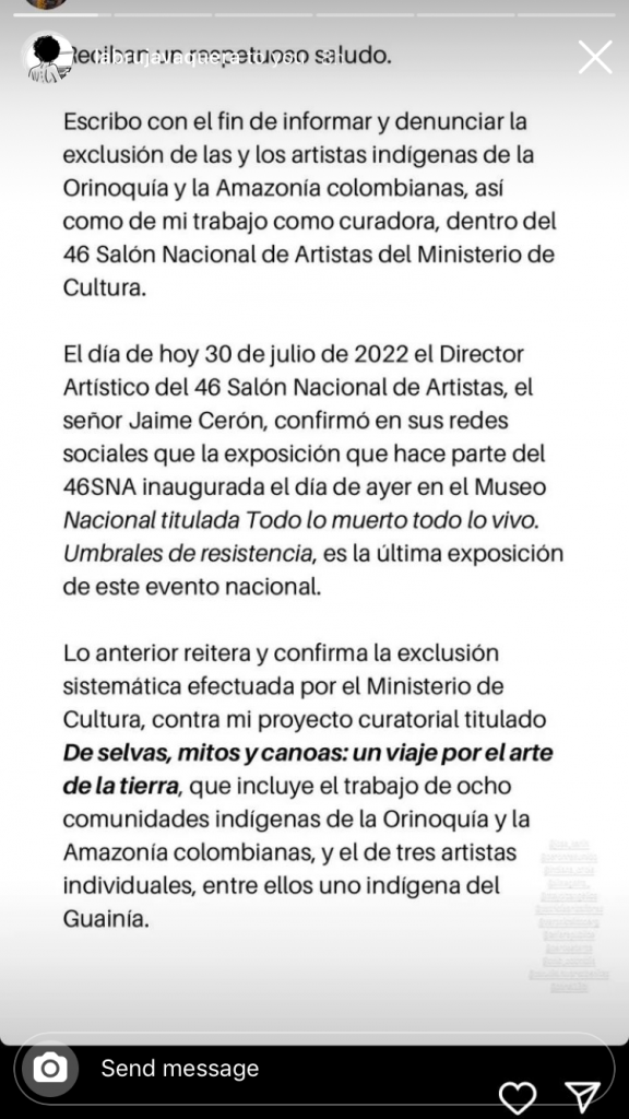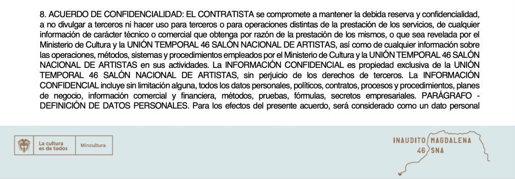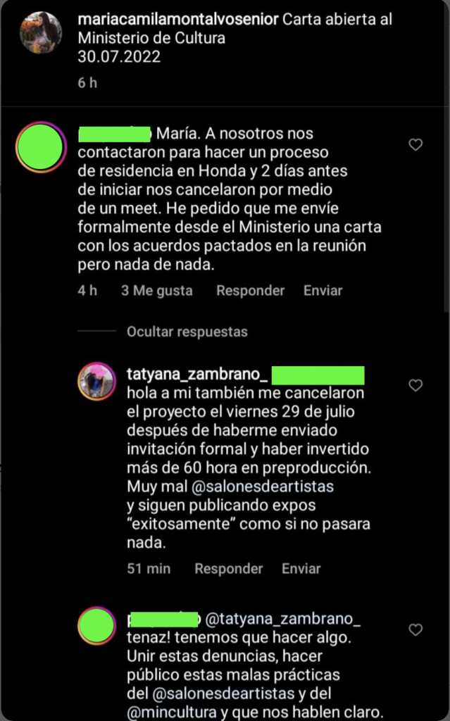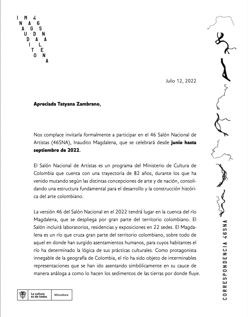 Continúan las denuncias, en este caso de la artista Tatyana Zambrano: Hola, Quiero darles las gracias por ayudarme a circular esta información sobre la situación en el Salón Nacional de Artistas de Colombia. A continuación, les adjunto la carta de invitación que me enviaron por parte del SNA46 el día julio 12 …