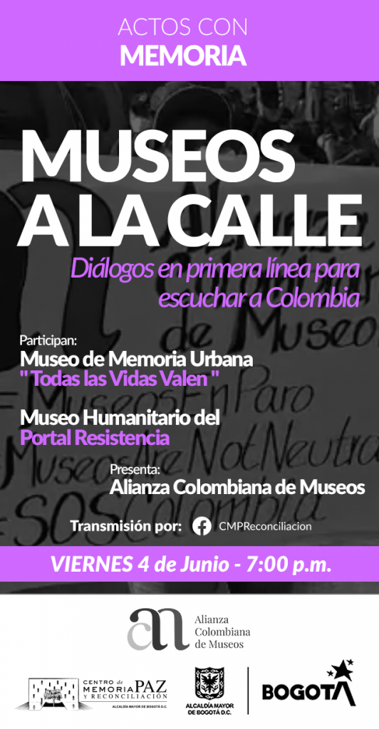 Por la Alianza Colombiana de Museos. Actos Con Memoria y la Alianza Colombiana de Museos presenta «Museos a la Calle», iniciativas museológicas comprometidas con las memorias vivas de la protesta ciudadana actual. Participan: Museo Humanitario Portal de la Resistencia, Museo de Memoria Urbana TODAS LAS VIDAS VALEN y Jardín Botánico de Medellín.
