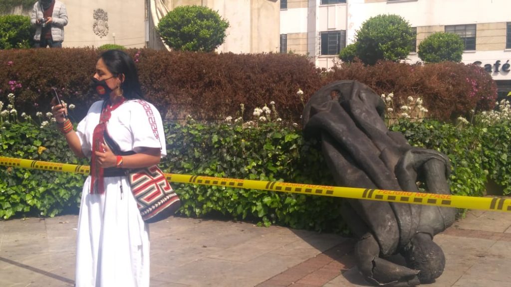 Cientos de indígenas Misak llegaron de nuevo hasta la estatua de Belalcázar con el fin de derribarla, pero el Esmad impidió el paso. Aquí las razones por las cuales la tumbaron. Tomado de: https://www.youtube.com/watch?v=E4497jTTOEw