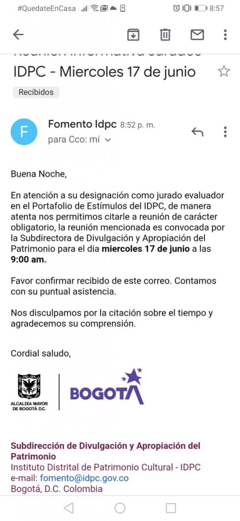 Respuesta de la Subdirección de divulgación de los valores del Patrimonio cultural al reclamo interpuesto por el artista Fernando Cruz por acoso laboral: Respetado Fernando, reciba un cordial saludo. En atención a su designación como jurado en el Portafolio de Estímulos del IDPC por medio del presente nos permitimos informarle que el día de hoy la …