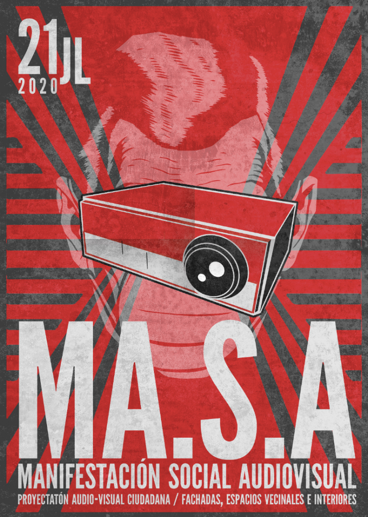 Manifestación Social Audiovisual. 2DA PROYECTATÓN AUDIO-VISUAL CIUDADANA / FACHADAS, ESPACIOS PÚBLICOS – SIMBÓLICOS -, ESPACIOS VECINALES E INTERIORES. VIDEOARTE + CUARENTENA + MANIFESTACIÓN SOCIAL. #SomosMASA Unión de iniciativa popular. Accionamos desde el lenguaje audiovisual/transmedia para ejercer el derecho fundamental a la manifestación social. Desde distintos territorios y por medio de procesos de creación y …