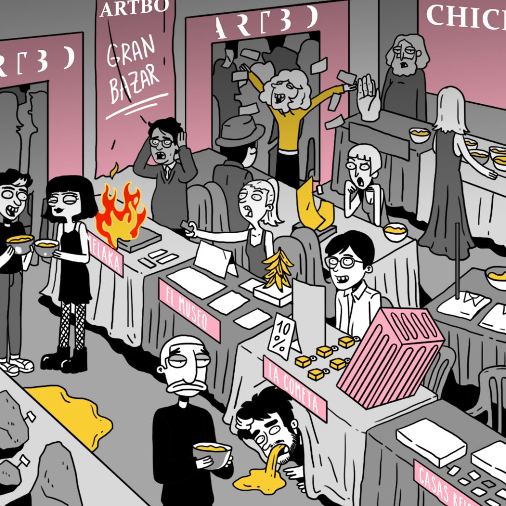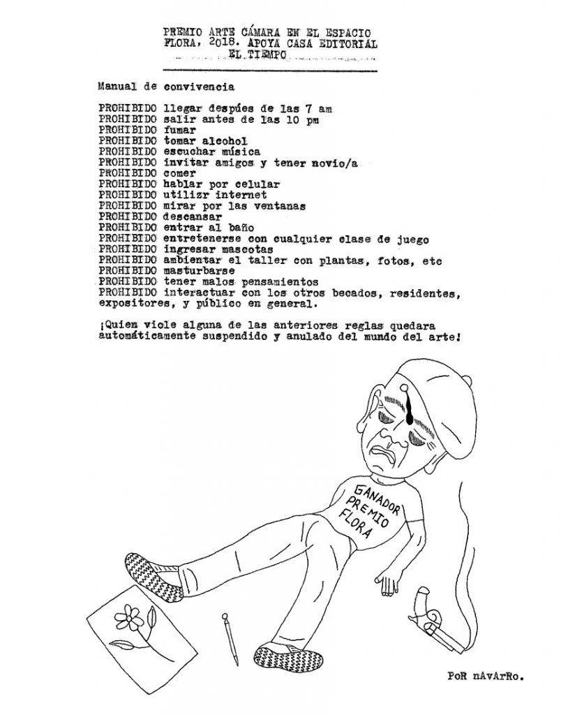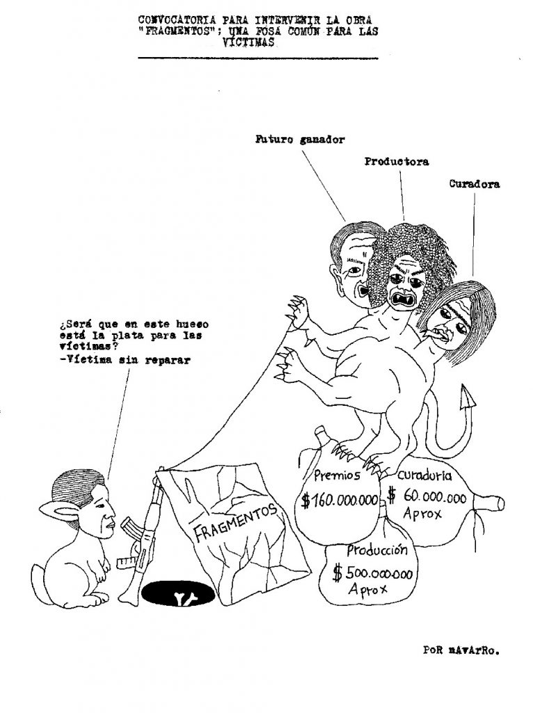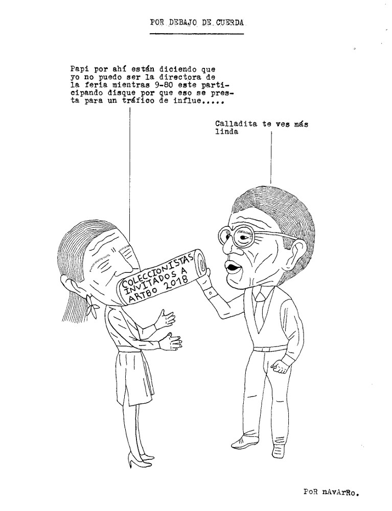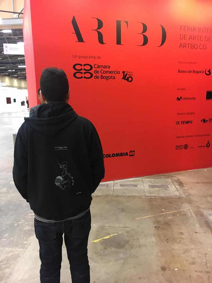 Durante la semana pasada, Iván Navarro desarrolló un performance: mandó imprimir sobre hoodies negros varias caricaturas críticas suyas sobre la Feria de arte de Bogotá, vendió algunas y se guardó otra para sí mismo. Como estaba trabajando semi-contratado por una galería, aprovechó para deambular libremente por el galpón donde se realizaba el evento y …