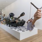 La exposición destaca por el volumen de sus obras. Por contraste, lleva a pensar en la inclinación de la amplia mayoría de artistas colombianos menores de 50 años por trabajar en espacios domésticos y jamás exigir lugares amplios de exhibición (habiéndose especializado en el dibujo mini o las artes de postproducción (con nulos presupuestos de producción)). Así, esta entrevista busca comprender la dificultad de realizar un proyecto de esta envergadura teniendo en cuenta dos condiciones: hace parte de un mediatizado evento de diplomacia cultural (del que nunca sobra conocer algunas de las dimensiones del diálogo organización-curaduría); y depende del trabajo de dos organizaciones altamente profesionalizadas (del que nunca sobra conocer la mutua traducción a que sometieron sus protocolos).